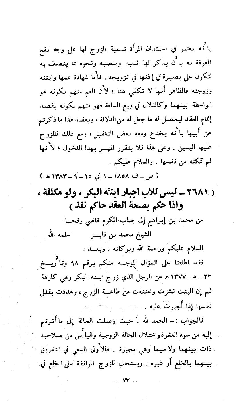 فقد اطلعنا على السؤال الموجه منكم برقم 98 وتاريخ 23-5-1377هـ على الرجل الذي زوج ابنته البكر وهي كارهة ثم إن البنت نشزت وامتنعت من طاعة الزوج وهددت بقتل نفسها إذا أجبرت عليه.