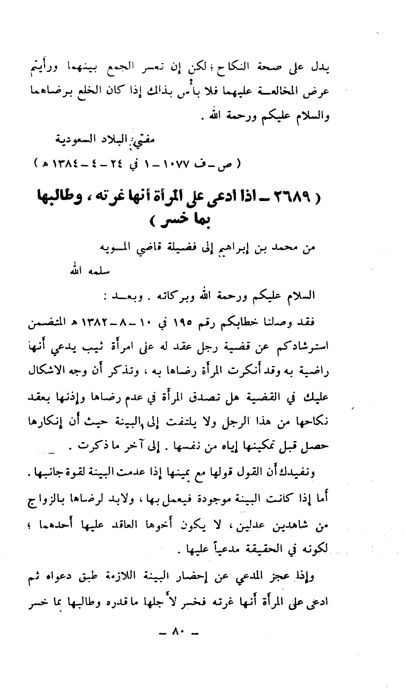 فقد وصلنا خطابكم رقم 195 في 10-8-1382هـ المتضمن استرشادكم عن قضية رجل عقد له على امرأة ثيب يدعي أنها راضية به وقد أنكرت المرأة رضاها به، وتذكر أن وجه الإشكال عليك في القضية هل تصدق المرأة في عدم رضاها وإذنها بعقد نكاحها من هذا الرجل ولا يلتفت إلى البينة حيث أن إنكارها حصل قبل تمكينها إياه من نفسها. إلى آخر ما ذكرت.