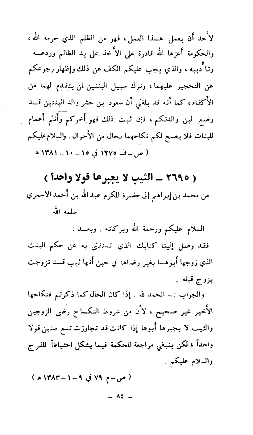 لأحد أن يعمل هذا العمل، فهو من الظلم الذي حرمه الله، والحكومة أعزها الله قادرة على الأخذ على يد الظالم وردعه وتأديبه، والذي يجب عليكم الكف عن ذلك وإظهار رجوعكم عن التحجير عليها، وترك سبيل البنتين لمن يتقدم لهما من الأكفاء، كما أنه قد بلغني أن سعود بن حشر والد البنتين قد وضع لبن والدتكم، فإن ثبت ذلك فهو أخوكم وأنتم أعمام للبنات فلا يصح لكم نكاحهما بحال من الأحوال. والسلام عليكم.