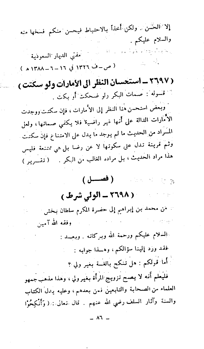 وبعض استحسن هنا النظر إلى الأمارات، فإن سكتت ووجدت الأمارات الدالة على أنها غير راضية فلا يكفي صماتها، ولعل المراد من الحديث ما لم يوجد ما يدل على الامتناع فإن سكتت وثم قرينة تدل على سكوتها لا عن رضا بل هي ممتنعة فليس هذا مراد الحديث، بل مراده الغالب من البكر. (تقرير) .