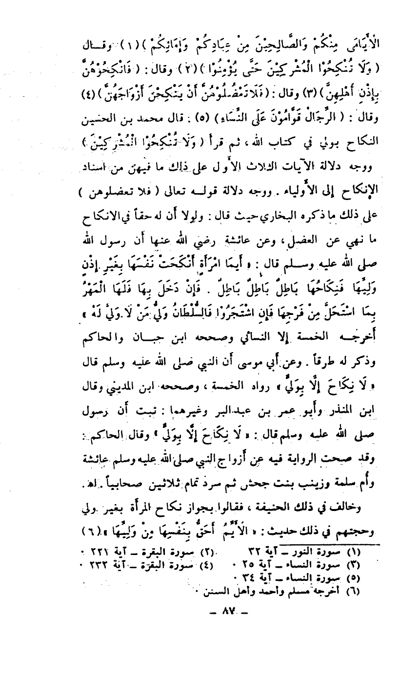 الأيامى منكم والصالحين من عبادكم وإيمائكم) (¬1) وقال: (ولا تنكحوا المشركين حتى يؤمنوا) (¬2) وقال (فانكحوهن بإذن أهلهن) (¬3) وقال (فلا تعضلومن أن ينكحن أزواجهن) (¬4) وقال (الرجال قوامون على النساء) (¬5) . قال محمد بن الحسين المكاح بولي في كتاب الله، ثم قرأ (ولا تنكحوا المشركين) ووجه دلالة الآيات الثلاث الأول على ذلك ذلك ما فيهن من اسناد الإنكاح إلى الأولياء. ووجه دلالة قوله تعالى (فلا تعضلوهن) على ذلك ما ذكره البخاري حيث قال: ولولا أن له حقاً في الإنكاح ما نهي عن الفضل، وعن عائشة رضي الله عنها أن الرسول صلى الله عليه وسلم قال: (أيما امرأة أنكحت نفسها بغير إذن وليها فنكاحها باطل باطل باطل. فإن دخل بها فله المهر بما ستحل من فرجها فإن اشتجروا فالسلطان ولي من ولا ولي له) . أخرجه الخمسة إلا النسائي وصححه ابن حبان والحاكم وذكر له طرقاً. وعن أبي موسى أن النبي صلى الله عليه وسلم قال (لا نكاح إلا بولي) رواه الخمسة وصححه ابن المديني وقال ابن المنذر وأبو عمر بن عبد البر وغيرهما: ثبت أن رسول الله صلى الله عليه وسلم قال: (لا نكاح إلا بولي) وقال الحاكم: وقد صحت الرواية فيه عن أزواج النبي صلى الله عليه وسلم عائشة وأم سلمة وزينب بنت جحش ثم سرد تمام ثلاثين صحابياً. اهـ.