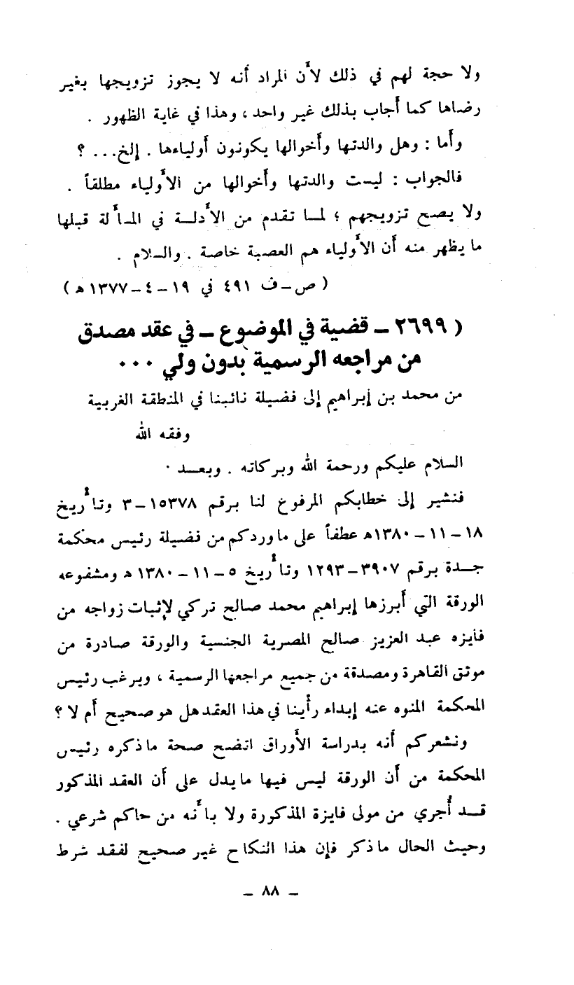 فنشير إلى خطابكم المرفوع لنا برقم 15378-3 وتاريخ 18-11-1380هـ عطفاً على ما وردكم من فضيلة رئيس محكمة جدة برقم 3907-1293 وتاريخ 5-11-1380هـ ومشفوعة الورقة التي أبرزها إبراهيم محمد صالح تركي لإثبات زواجه من فايزة عبد العزيز صالح المصرية الجنسية والورقة صادرة من موثق القاهرة ومصدق من جميع مراجعها الرسمية. ويرغب رئيس المحكمة المنوه عنه إبداء رأينا في هذا العقد هل صحيح أم لا؟