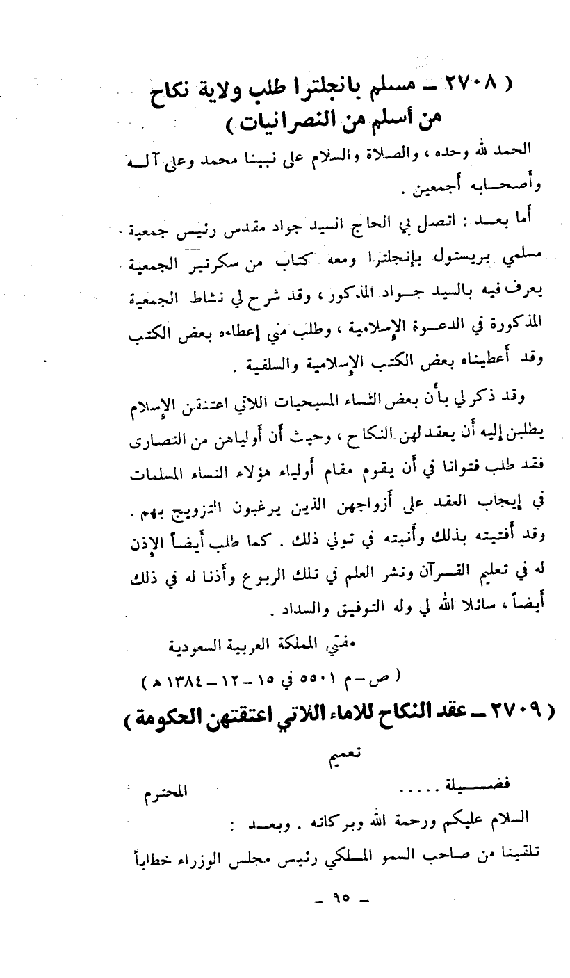 وقد ذكر لي بأن بعض النساء المسيحيات اللاتي اعتنقن الإسلام يطلبن إليه أن يعقد لهن النكاح، وحيث أن أولياهن من النصارى فقد طلب فتوانا في أن يقوم مقام أولياء هؤلاء النساء المسلمات في إيجاب العقد على أزواجهن الذين يرغبون التزويج بهم. وقد أفتيته بذلك وأنبته في تولي ذلك. كما طلب أيضاً الإذن له في تعليم القرآن ونشر العلم في تلك الربوع وأذنا له في ذلك أيضاً، سائلاً الله لي وله التوفيق والسداد.