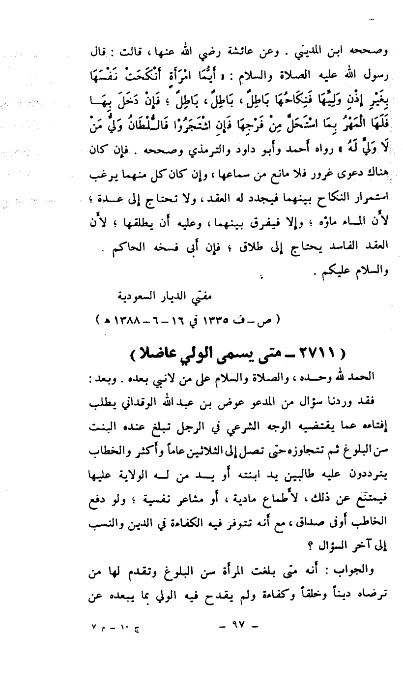 فقد وردنا سؤال من المدعو عوض بن عبد الله الوقداني يطلب إفتاءه عما يقتضيه الوجه الشرعي في الرجل تبلغ عنده البنت سن البلوغ ثم تتجاوزه حتى تصل إلى الثلاثين عاماً وأكثر والخطاب يترددون عليه طالبين يد ابنته أو يد من له الولاية عليها فيمتنع عن ذلك، لأطماع مادية، أو مشاعر نفسية ولو دفع الخاطب أوفى صداق مع أنه تتوفر فيه الكفاءة في الدين والنسب إلى آخر السؤال؟