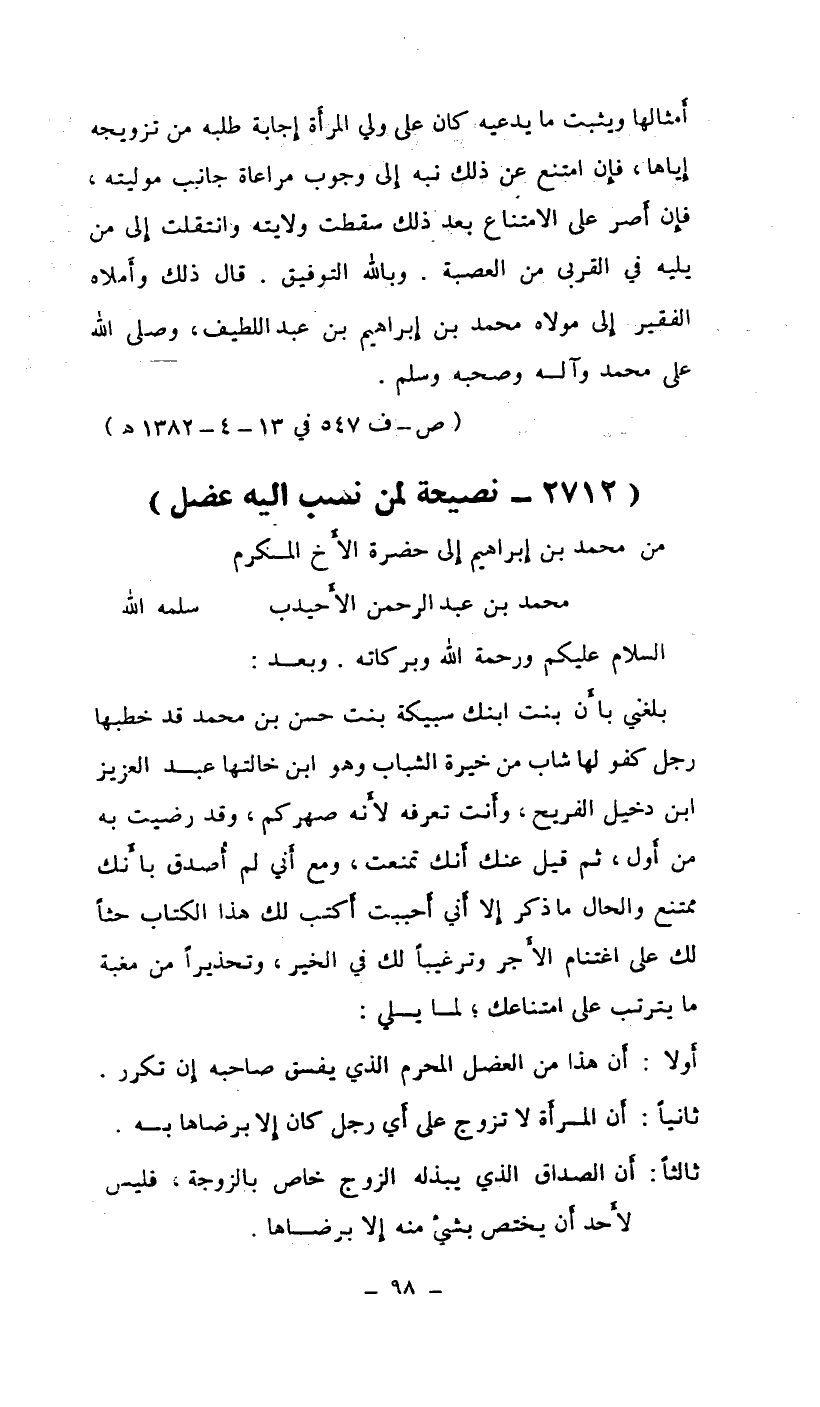 بلغني بأن بنت ابنك سبيكة بنت حسن بن محمد قد خطبها رجل كفؤ لها شاب من خيرة الشباب وهو ابن خالتها عبد العزيز ابن دخيل الفريج. وأنت تعرفه لأنه صهركم، وقد رضيت به من أول، ثم قيل عنك أنك تمنعت، ومع أني لم أصدق بأنك ممتنع والحال ما ذكر إلا أني أحببت أكتب لك هذا الكتاب حثاً لك على اغتنام الأجر وترغيباً لك في الخير. وتحذيراً من مغبة ما يترتب على امتناعك، لما يلي: