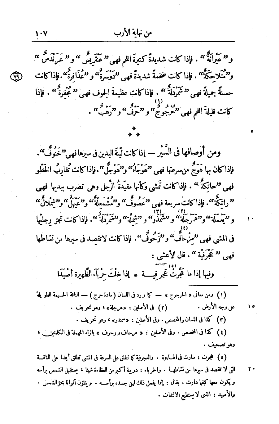 و «عيرانة» . فإذا كانت شديدة كثيرة اللحم فهى «عنتريس» و «عرندس» و «متلاحكة» . فإذا كانت ضخمة شديدة فهى «دوسرة» و «عذافرة» . فإذا كانت حسنة جميلة فهى «شمردلة» . فإذا كانت عظيمة الجوف فهى «مجفرة» . فإذا كانت قليلة اللحم فهى «حرجوج» «1» و «حرف» و «رهب» .