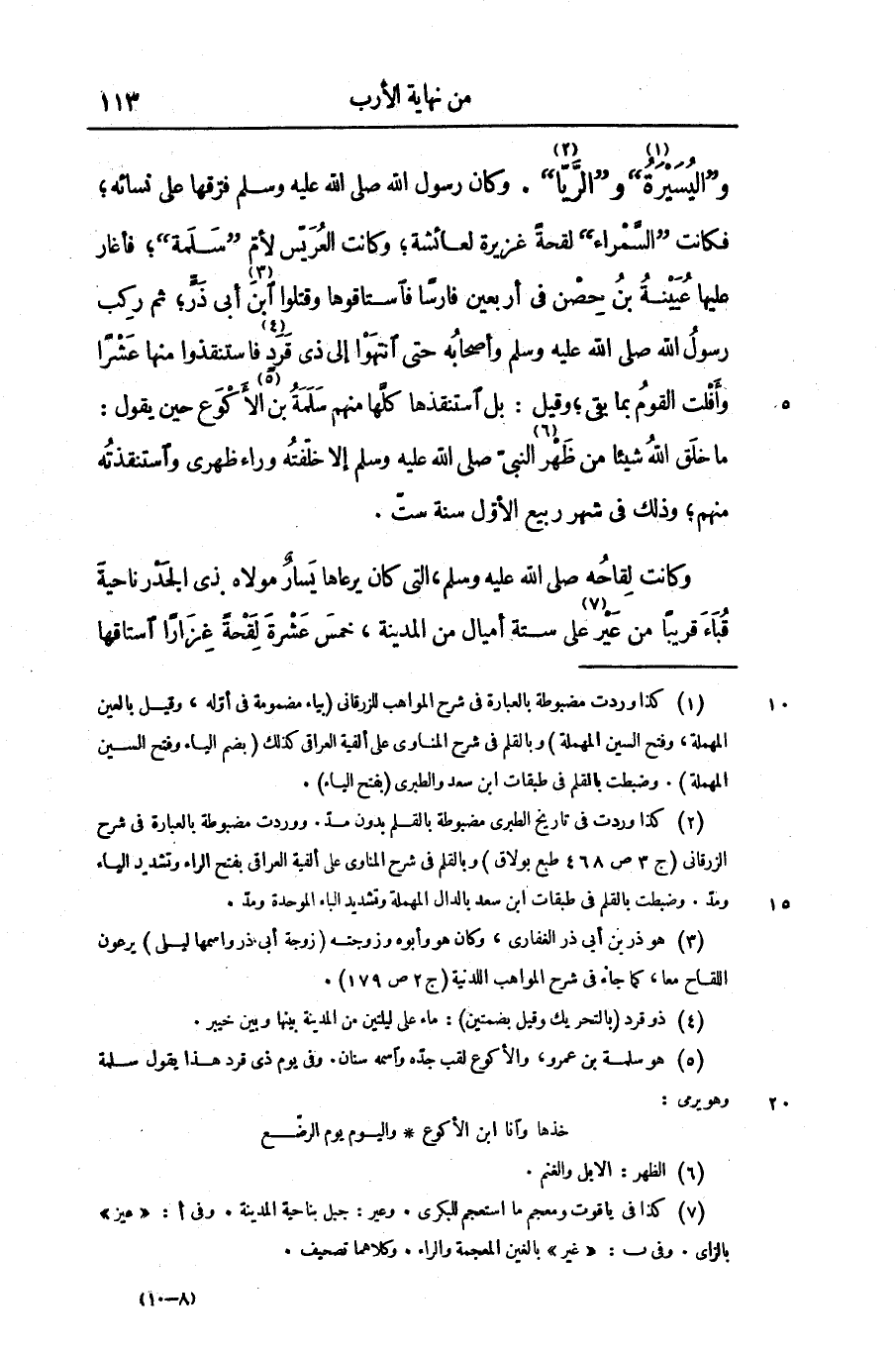 و «اليسيرة» «1» و «الرّيّا» «2» . وكان رسول الله صلى الله عليه وسلم فرّقها على نسائه؛ فكانت «السّمراء» لقحة غزيرة لعائشة؛ وكانت العريّس لأمّ «سلمة» ؛ فأغار عليها عيينة بن حصن فى أربعين فارسا فاستاقوها وقتلوا ابن «3» أبى ذرّ؛ ثم ركب رسول الله صلى الله عليه وسلم وأصحابه حتى انتهوا إلى ذى قرد «4» فاستنقذوا منها عشرا وأفلت القوم بما بقى؛ وقيل: بل استنقذها كلّها منهم سلمة بن «5» الأكوع حين يقول: