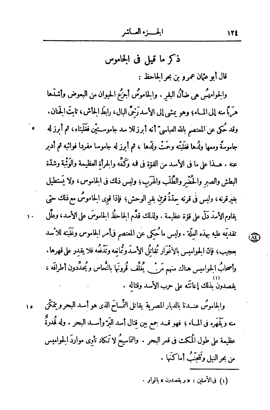 وقد حكى عن المعتصم بالله العباسىّ أنه أبرز للاسد جاموستين فغلبتاه، ثم أبرز له جاموسة ومعها ولدها فغلبته وحمت ولدها، ثم أبرز له جاموسا مفردا فواثبه ثم أدبر عنه. هذا على ما فى الأسد من القوّة فى فمه وكفّه والجرأة العظيمة والوثبة وشدّة البطش والصبر والحضر والطّلب والهرب؛ وليس ذلك فى الجاموس، ولا يستطيل بغير قرنه، وليس فى قرنه حدّة قرن بقر الوحش؛ فإذا قوى الجاموس مع ذلك حتى يقاوم الأسد دلّ على قوّة عظيمة. ولذلك قدّم الجاحظ الجاموس على الأسد، وعلّل تقديمه عليه بهذه العلّة. وليس ما حكى عن المعتصم فى أمر الجاموس وغلبته للأسد بعجيب؛ فإنّ الجواميس بالأغوار تقاتل الأسد وتمانعه وتدفعه فلا يقدر على قهرها.