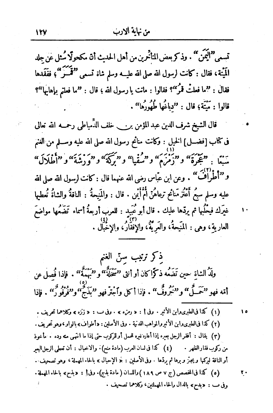 قال الشيخ شرف الدين عبد المؤمن بن خلف الدّمياطى رحمه الله تعالى فى كتاب [فضل] الخيل: وكانت منائح رسول الله صلى الله عليه وسلم من الغنم سبعا: «عجرة» و «زمزم «1» » و «سقيا» و «بركة» و «ورشة» و «أطلال» و «أطراف «2» » . وعن ابن عبّاس رضى الله عنهما قال: كانت لرسول الله صلى الله عليه وسلم سبع أعنز منائح ترعاهنّ أمّ أيمن. قال: والمنيحة: الناقة والشاة تعطيها غيرك فيحلبها ثم يردّها عليك. قال أبو عبيد: للعرب أربعة أسماء تضعها مواضع العارية، وهى: المنيحة، والعريّة، والإفقار «3» ، والإخبال «4» .