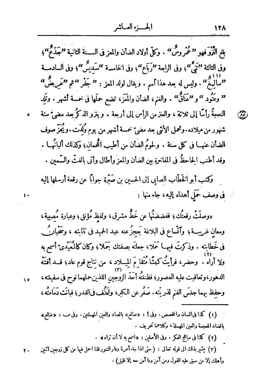 «وصلت رقعتك؛ ففضضتها عن خطّ مشرق، ولفظ مؤنق؛ وعبارة مصيبة، ومعان غريبة؛ واتّساع فى البلاغة يعجز عنه عبد الحميد فى كتابته، وسحبان فى خطابته. وذكرت فيها حملا، جعلته بصفتك جملا؛ وكان كالمعيدىّ أسمع به ولا أراه «2» . وحضر، فرأيت كبشا متقام الميلاد، من نتاج قوم عاد؛ قد أفنته الدهور، وتعاقبت عليه العصور؛ فظننته أحد الزوجين «3» اللذين حملهما نوح فى سفينته، وحفظ بهما جنس الغنم لذريّته. صغر عن الكبر، ولطف فى القدر؛ فبانت دمامته،