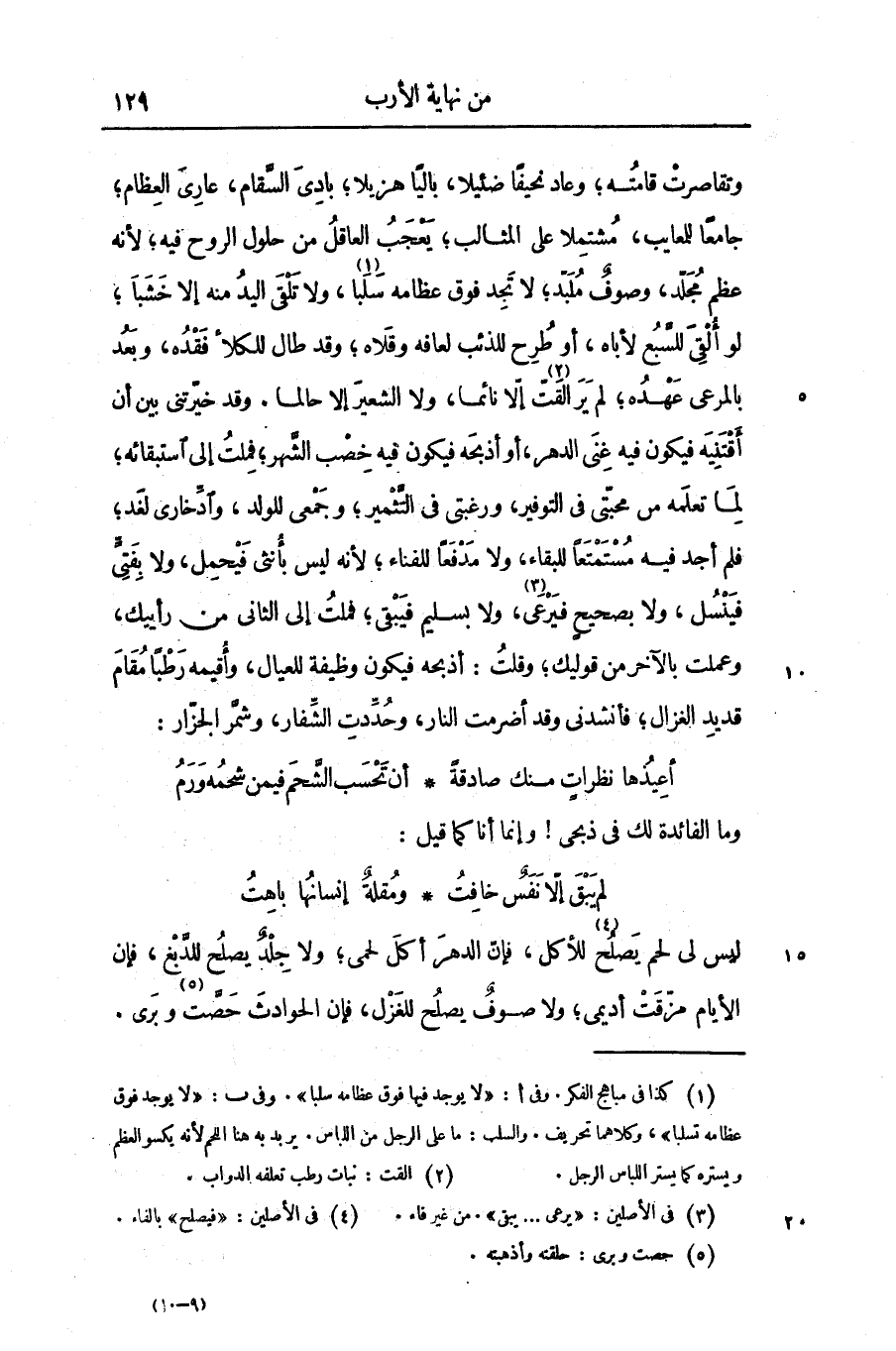 وتقاصرت قامته؛ وعاد نحيفا ضئيلا، باليا هزيلا؛ بادى السّقام، عارى العظام؛ جامعا للمعايب، مشتملا على المثالب؛ يعجب العاقل من حلول الروح فيه؛ لأنه عظم مجلّد، وصوف ملبّد؛ لا تجد فوق عظامه سلبا «1» ، ولا تلقى اليد منه إلا خشبا؛ لو ألقى للسّبع لأباه، أو طرح للذئب لعافه وقلاه؛ وقد طال للكلأ فقده، وبعد بالمرعى عهده؛ لم ير القتّ «2» إلّا نائما، ولا الشعير إلا حالما. وقد خيّرتنى بين أن أقتنيه فيكون فيه غنى الدهر، أو أذبحه فيكون فيه خصب الشّهر؛ فملت إلى استبقائه؛ لما تعلمه من محبّتى فى التوفير، ورغبتى فى التّثمير؛ وجمعى للولد، وادّخارى لغد؛ فلم أجد فيه مستمتعا للبقاء، ولا مدفعا للفناء؛ لأنه ليس بأنثى فيحمل، ولا بفتىّ فينسل، ولا بصحيح فيرعى «3» ، ولا بسليم فيبقى؛ فملت إلى الثانى من رأييك، وعملت بالآخر من قوليك؛ وقلت: أذبحه فيكون وظيفة للعيال، وأقيمة رطبا مقام قديد الغزال؛ فأنشدنى وقد أضرمت النار، وحدّدت الشّفار، وشمّر الجزّار: