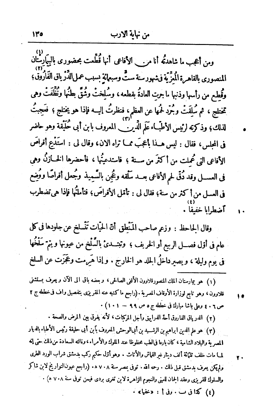 ومن أعجب ما شاهدته أنا من الأفاعى أنها قطّعت بحضورى بالبيمارستان «1» المنصورى بالقاهرة المعزّيّة فى شهور سنة ستّ وسبعمائة بسبب عمل الدّرياق الفاروق «2» ؛ وقطع من رأسها وذنبها ما جرت العادة بقطعه، وسلخت وشقّ بطنها ونظّفت وهى تختلج، ثم سلقت وجرّد لحمها عن العظم، فنظرت إليه فإذا هو يختلج؛ فعجبت لذلك؛ وذكرته لرئيس الأطبّاء علم الدّين «3» المعروف بابن أبى حليقة وهو حاضر فى المجلس، فقال: ليس هذا بأعجب مما تراه الان، وقال لى: استدع أقراص الأفاعى التى عملت من أكثر من سنة؛ فاستدعيتها، فأحضرها الخازن وهى فى العسل وقد دقّ لحم الأفاعى بعد سلقه وعجن بالسّميذ وجعل أقراصا ووضع فى العسل من أكثر من سنة؛ فقال لى: تأمّل الأقراص؛ فتأملتها فإذا هى تضطرب اضطرابا خفيفا «4» .
