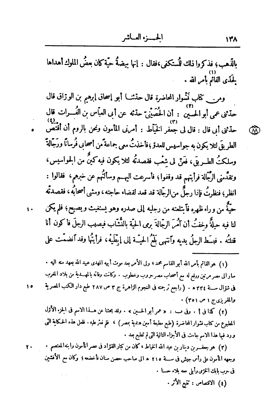 ومن كتاب نشوار المحاضرة قال حدّثنا أبو إسحاق إبرهيم بن الورّاق قال حدّثنى عمى أبو الحسين «2» : أن الحصينىّ حدّثه عن أبى العبّاس بن الفرات قال حدّثنى أبى قال: قال لى جعفر «3» الخيّاط: أمرنى المأمون ونحن بالروم أن أقتصّ»