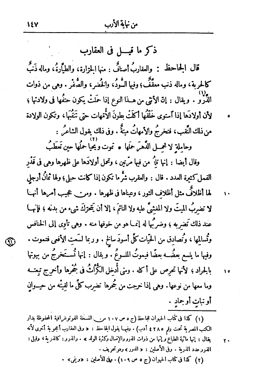 وقال أيضا: إنها تلد من فيها مرّتين، وتحمل أولادها على ظهرها وهى فى قدر القمل كثيرة العدد. قال: والعقرب شرّ ما تكون إذا كانت حبلى؛ ولها ثمان أرجل لها أظلاف مثل أظلاف الثور، وعيناها فى ظهرها. ومن عجيب أمرها أنها لا تضرب الميت ولا المغشىّ عليه ولا النائم، إلا أن يتحرّك شىء من بدنه؛ فإنها عند ذلك تضربه؛ وضربها له إنما هو من خوفها منه. وهى تأوى إلى الخنافس وتسالمها، وتصادق من الحيّات كلّ أسود سالخ. وربما لسعت الأفعى فتموت.