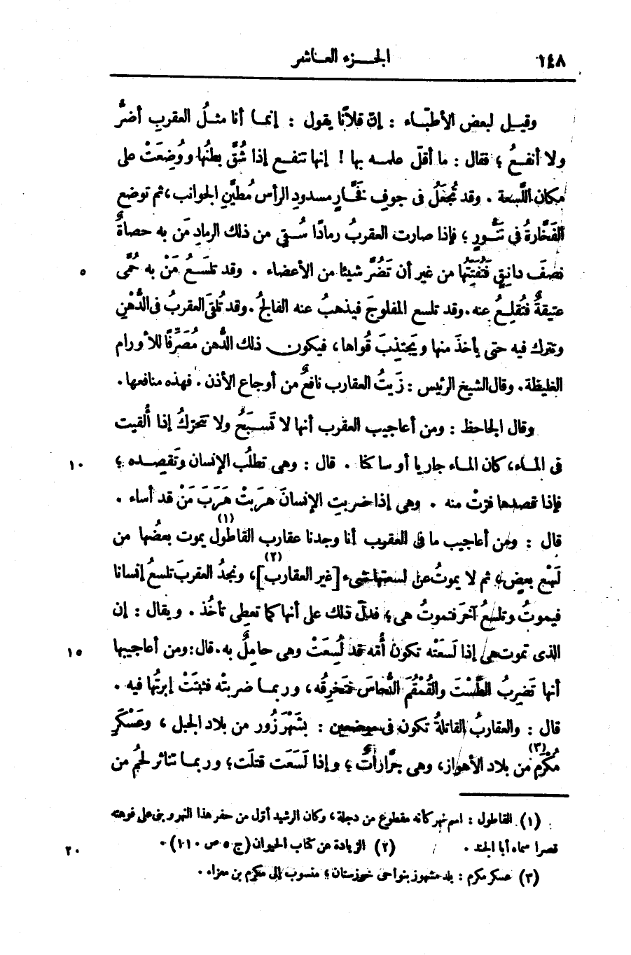 قال: والعقارب القاتلة تكون فى موضعين: بشهرزور من بلاد الجبل، وعسكر مكرم «3» من بلاد الأهواز، وهى جرّارات؛ وإذا لسعت قتلت؛ وربما تناثر لحم من