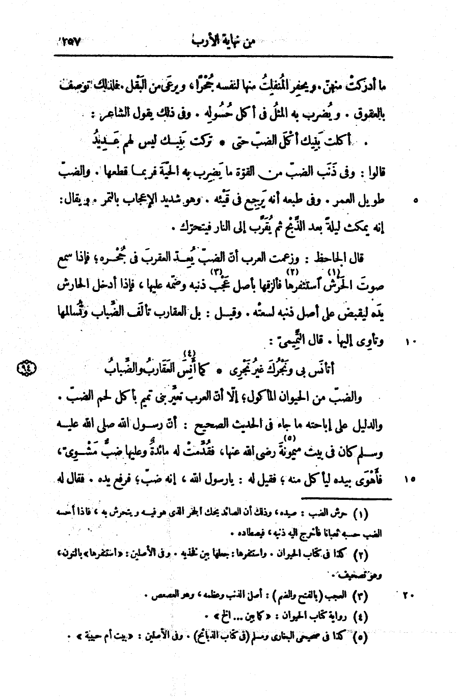 قال الجاحظ: وزعمت العرب أنّ الضبّ يعدّ العقرب فى جحره؛ فإذا سمع صوت الحرش «1» استثفرها «2» فألزقها بأصل عجب «3» ذنبه وضمّه عليها، فإذا أدخل الحارش يده ليقبض على أصل ذنبه لسعته. وقيل: بل العقارب تألف الضّباب وتسالمها وتأوى إليها. قال التّميمىّ: