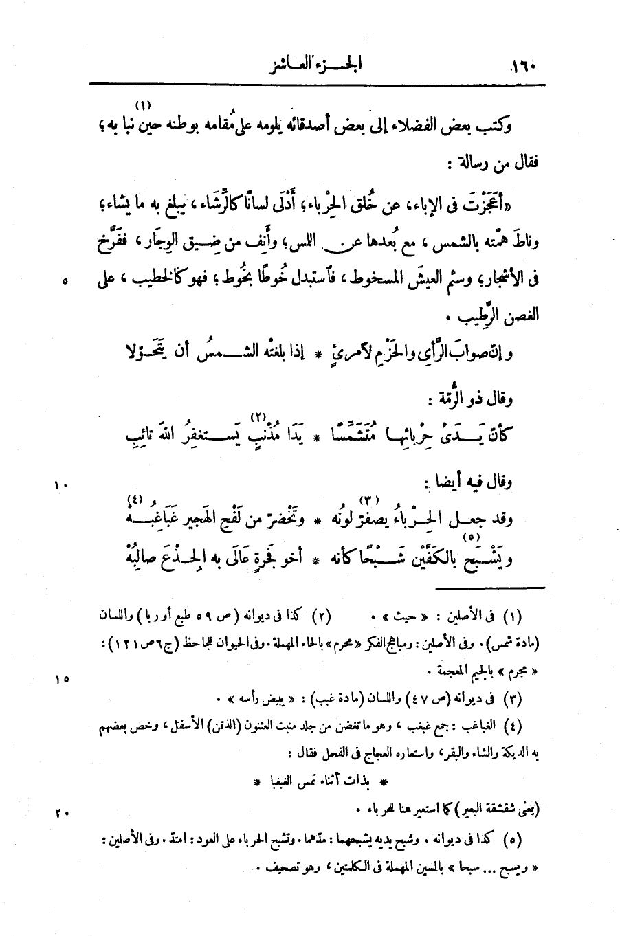 «أعجزت فى الإباء، عن خلق الحرباء؛ أدلى لسانا كالرّشاء، يبلغ به ما يشاء؛ وناط همّته بالشمس، مع بعدها عن اللمس؛ وأنف من ضيق الوجار، ففرّخ فى الأشجار؛ وسئم العيش المسخوط، فاستبدل خوطا بخوط؛ فهو كالخطيب، على الغصن الرّطيب.