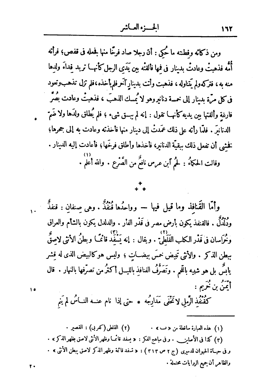 ومن ذكائه وفطنته ما حكى: أنّ رجلا صاد فرخا منها فجعله فى قفص؛ فرأته أمّه فذهبت وعادت بدينار فى فمها فألقته بين يدى الرجل كأنها تريد فداء ولدها منه به، فتركه ولم يتناوله، فذهبت وأتت بدينار آخر فلم يأخذه، فلم تزل تذهب وتعود فى كل مرّة بدينار إلى خمسة دنانير وهو لا يمسك الذهب، فذهبت وعادت بصرّ فارغة وألقتها بين يديه كأنها تقول: إنه لم يبق شىء؛ فلم يطلق ولدها ولا ضمّ الدنانير. فلمّا رأته على ذلك عمدت إلى دينار منها فأخذته وعادت به إلى جحرها؛ فخشى أن تفعل ذلك ببقيّة الدنانير، فأخذها وأطلق فرخها؛ فأعادت إليه الدينار.
