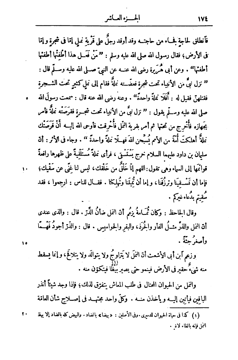 «نزل نبىّ من الأنبياء تحت شجرة فعضّته نملة فقام إلى نمل كثير تحت الشجرة فقتلهنّ فقيل له: أفلا نملة واحدة» . وعنه رضى الله عنه قال: سمعت رسول الله صلى الله عليه وسلم يقول: «نزل نبىّ من الأنبياء تحت شجرة فقرصته نملة فأمر بجهازه فأخرج من تحتها ثم أمر بقرية النّمل فأحرقت فأوحى الله إليه أن قرصتك نملة أهلكت أمّة من الأمم يسبّحن الله فهلّا نملة واحدة» . وجاء فى الأثر: أنّ سليمان بن داود عليهما السلام خرج يستسقى، فرأى نملة مستلقية على ظهرها رافعة قوائمها إلى السماء وهى تقول: اللهم إنّا خلق من خلقك، ليس لنا غنى عن سقيك؛ فإما أن تسقينا وترزقنا، وإما أن تميتنا وتهلكنا. فقال للناس: ارجعوا، فقد سقيتم بدعاء غيركم.