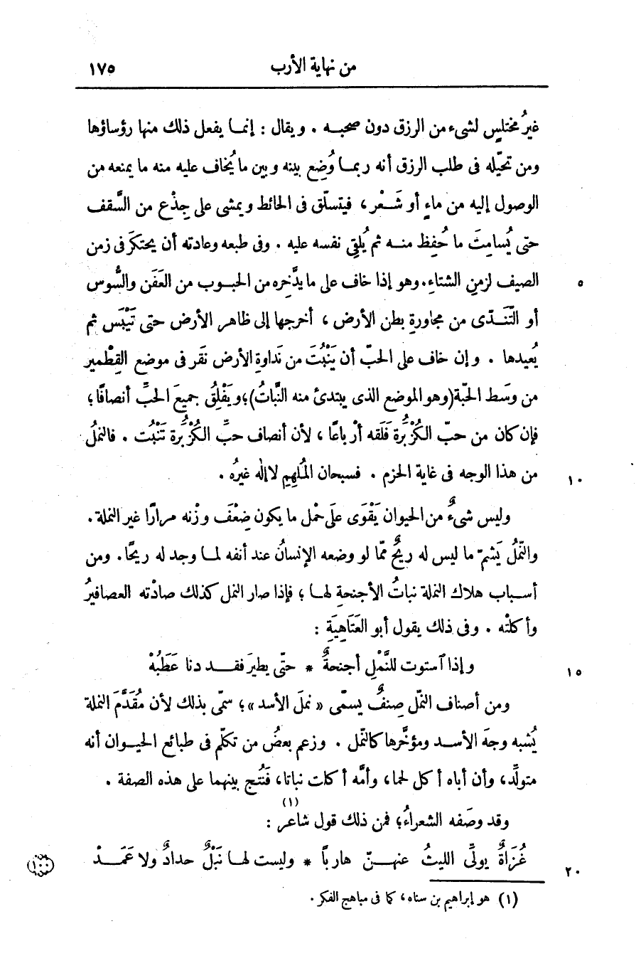 غير مختلس لشىء من الرزق دون صحبه. ويقال: إنما يفعل ذلك منها رؤساؤها ومن تحيّله فى طلب الرزق أنه ربما وضع بينه وبين ما يخاف عليه منه ما يمنعه من الوصول إليه من ماء أو شعر، فيتسلّق فى الحائط ويمشى على جذع من السّقف حتى يسامت ما حفظ منه ثم يلقى نفسه عليه. وفى طبعه وعادته أن يحتكر فى زمن الصيف لزمن الشتاء. وهو إذا خاف على ما يدّخره من الحبوب من العفن والسّوس أو التّندّى من مجاورة بطن الأرض، أخرجها إلى ظاهر الأرض حتى تيبس ثم يعيدها. وإن خاف على الحبّ أن ينبت من نداوة الأرض نقر فى موضع القطمير من وسط الحبّة (وهو الموضع الذى يبتدئ منه النّبات) ؛ ويفلق جميع الحبّ أنصافا؛ فإن كان من حبّ الكزبرة فلقه أرباعا، لأن أنصاف حبّ الكزبرة تنبت. فالنمل من هذا الوجه فى غاية الحزم. فسبحان الملهم لا إله غيره.
