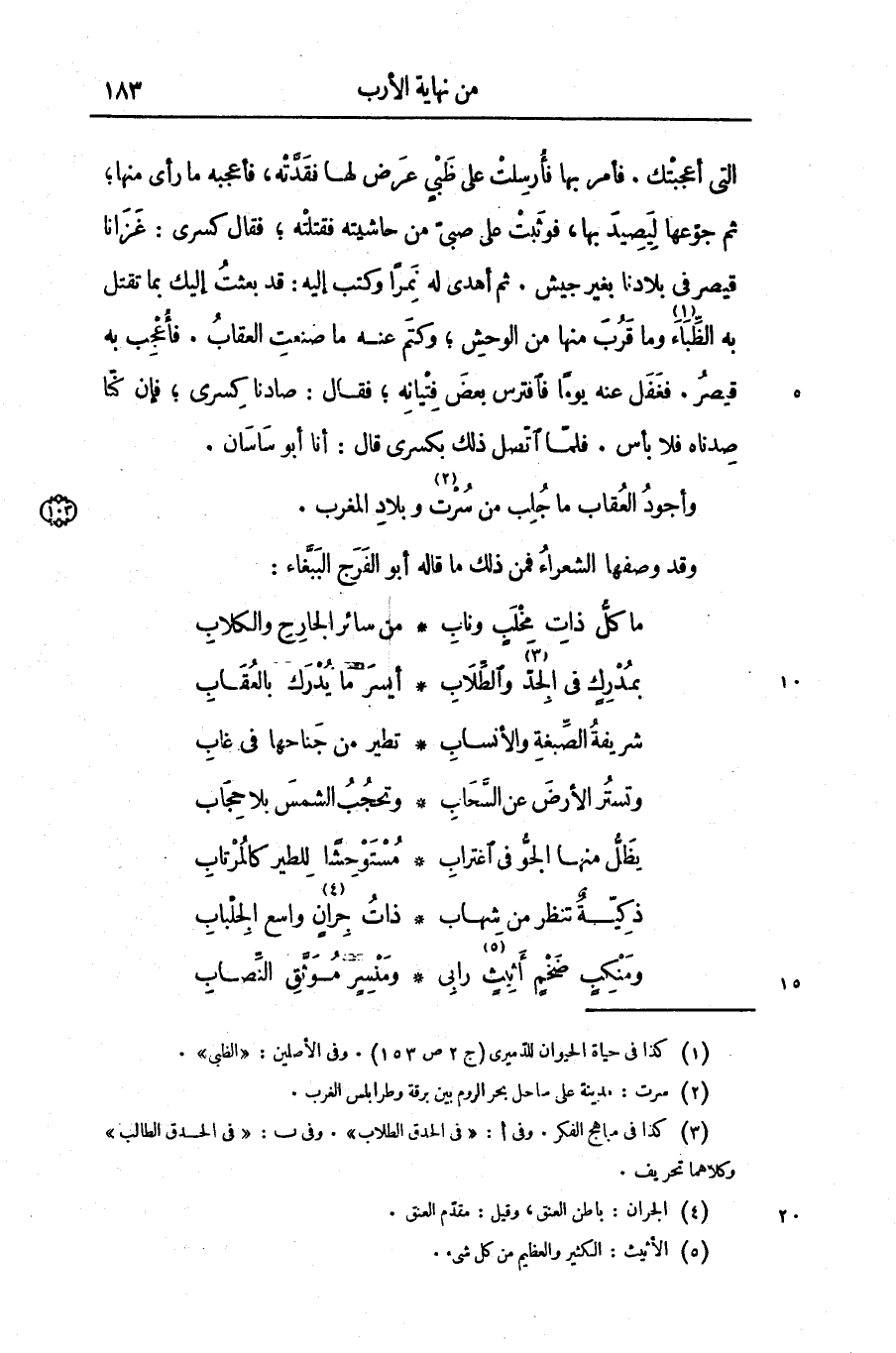 التى أعجبتك. فأمر بها فأرسلت على ظبى عرض لها فقدّته، فأعجبه ما رأى منها؛ ثم جوّعها ليصيد بها، فوثبت على صبىّ من حاشيته فقتلته؛ فقال كسرى: غزانا قيصر فى بلادنا بغير جيش. ثم أهدى له نمرا وكتب إليه: قد بعثت إليك بما تقتل به الظّباء «1» وما قرب منها من الوحش؛ وكتم عنه ما صنعت العقاب. فأعجب به قيصر. فغفل عنه يوما فافترس بعض فتيانه؛ فقال: صادنا كسرى؛ فإن كنّا صدناه فلا بأس. فلمّا اتّصل ذلك بكسرى قال: أنا أبو ساسان.
