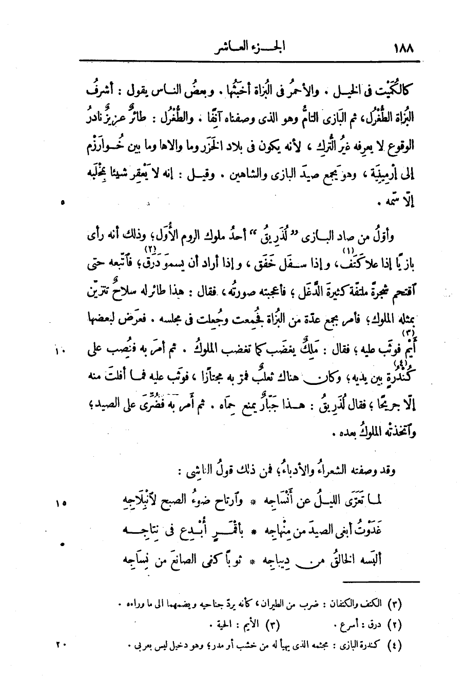 وأوّل من صاد البازى «لذريق» أحد ملوك الروم الأوّل؛ وذلك أنه رأى بازيا إذا علا كتف «1» ، وإذا سفل خفق، وإذا أراد أن يسمو درق «2» ؛ فاتّبعه حتى اقتحم شجرة ملتفّة كثيرة الدّغل؛ فأعجبته صورته، فقال: هذا طائر له سلاح تتزيّن بمثله الملوك؛ فأمر بجمع عدّة من البزاة فجمعت وجعلت فى مجلسه. فعرض لبعضها أيم «3» فوثب عليه؛ فقال: ملك يغضب كما تغضب الملوك. ثم أمر به فنصب على كندرة «4» بين يديه؛ وكان هناك ثعلب فمرّ به مجتازا، فوثب عليه فما أفلت منه إلّا جريحا؛ فقال لذريق: هذا جبّار يمنع حماه. ثم أمر به فضرّى على الصيد؛ واتخذته الملوك بعده.