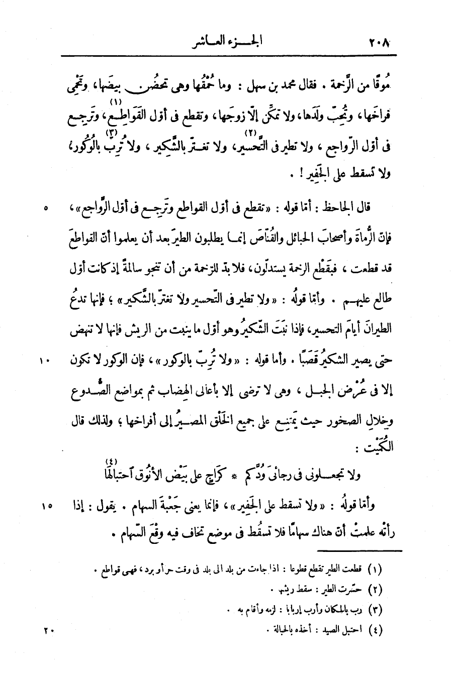 موقا من الزّحمة. فقال محمد بن سهل: وما حمقها وهى تحضن بيضها، وتحمى فراخها، وتحبّ ولدها، ولا تمكّن إلّا زوجها، وتقطع فى أوّل القواطع «1» ، وترجع فى أوّل الرّواجع، ولا تطير فى التّحسير «2» ، ولا تغترّ بالشّكير، ولا تربّ «3» بالوكور، ولا تسقط على الجفير!.