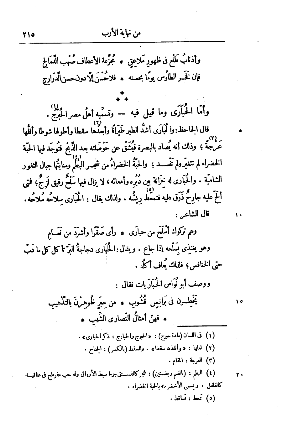 قال الجاحظ: والحبارى أشدّ الطير طيرانا وأبعدها «2» سقطا وأطولها شوطا وأقلّها عرجة «3» ؛ وذلك أنه يصاد بالبصرة فيشقّ عن حوصلته بعد الذّبح فتوجد فيها الحبّة الخضراء لم تتغيّر ولم تفسد؛ والحبّة الخضراء من شجر البطم «4» ومنابتها جبال الثغور الشاميّة. والحبارى له خزانة بين دبره وأمعائه، لا يزال فيها سلح رقيق لزج؛ فمتى ألحّ عليه جارح ذرق عليه فتمعّط «5» ريشه. ولذلك يقال: الحبارى سلاحه سلاحه.