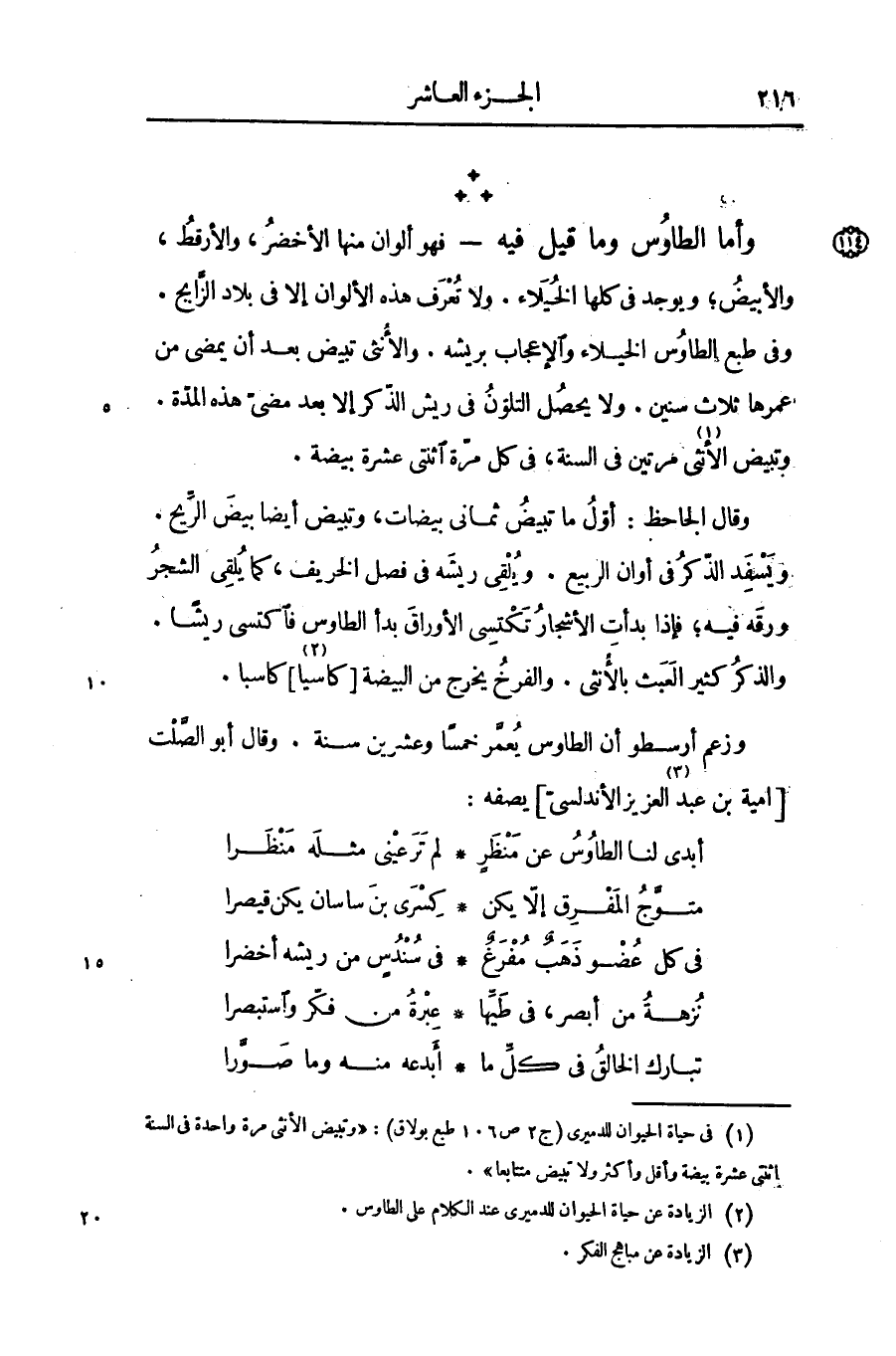 وزعم أرسطو أن الطاوس يعمّر خمسا وعشرين سنة. وقال أبو الصّلت [امية بن عبد «3» العزيز الأندلسىّ] يصفه: