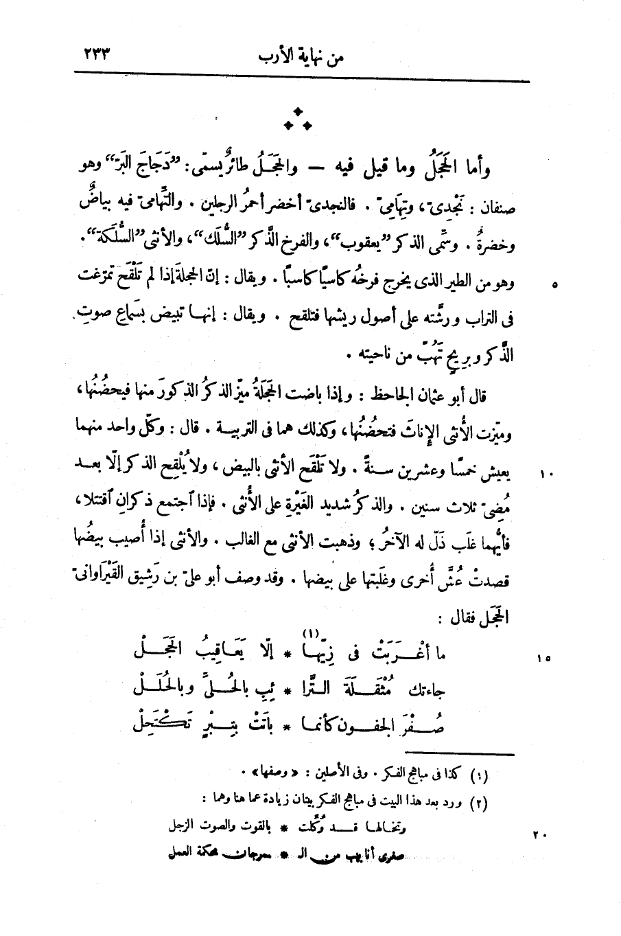 قال أبو عثمان الجاحظ: وإذا باضت الحجلة ميّز الذكر الذكور منها فيحضنها، وميّزت الأنثى الإناث فتحضنها، وكذلك هما فى التربية. قال: وكلّ واحد منهما يعيش خمسا وعشرين سنة. ولا تلقح الأنثى بالبيض، ولا يلقح الذكر إلّا بعد مضىّ ثلاث سنين. والذكر شديد الغيرة على الأنثى. فإذا اجتمع ذكران اقتتلا، فأيّهما غلب ذلّ له الآخر؛ وذهبت الأنثى مع الغالب. والأنثى إذا أصيب بيضها قصدت عشّ أخرى وغلبتها على بيضها. وقد وصف «1» أبو علىّ بن رشيق القيراوانىّ الحجل فقال: