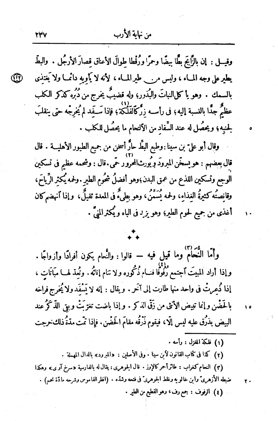 وإذا أراد المبيت اجتمع رفوفا «4» فنام ذكوره ولا تنام إناثه. وتعدّ لها مباتات، إذا ذعرت فى واحد منها طارت إلى آخر. ويقال: إنه لا يسفد ولا يخرج فراخه بالحضن وإنما تبيض الأنثى من زقّ الذكر. وإذا باضت تغرّبت وبقى الذّكر عند البيض يذرق عليه ليس إلّا، فيقوم ذرقه مقام الحضن. فإذا تمّت مدّة ذلك خرجت