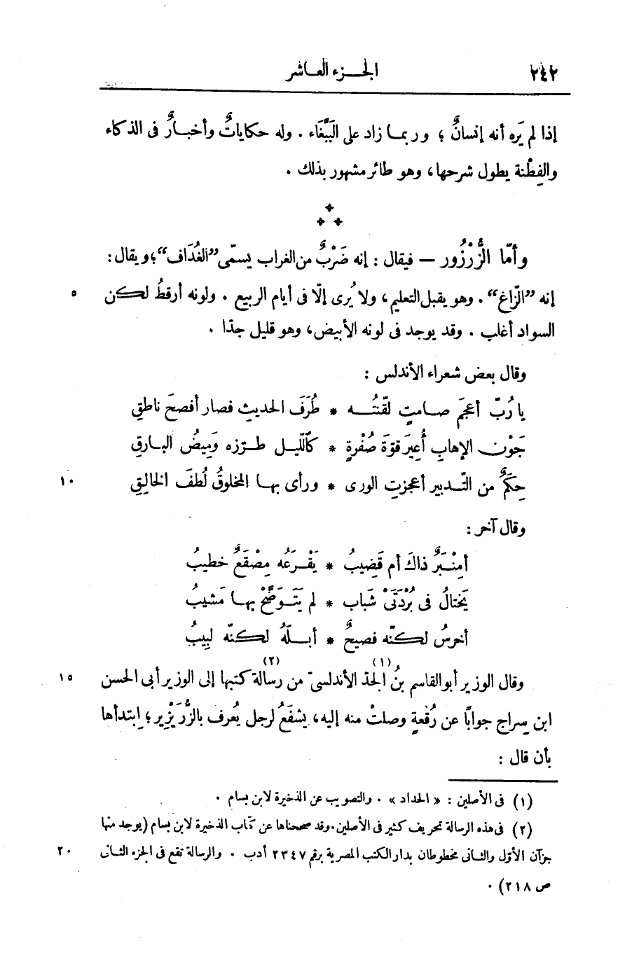 وقال الوزير أبو القاسم بن الجدّ «1» الأندلسىّ من رسالة «2» كتبها إلى الوزير أبى الحسن ابن سراج جوابا عن رقعة وصلت منه إليه، يشفع لرجل يعرف بالزّريزير؛ ابتدأها بأن قال: