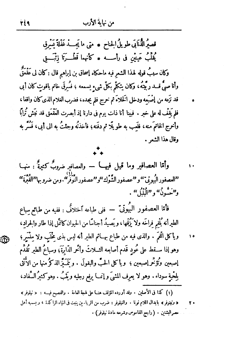 - والعصافير ضروب كثيرة: منها «العصفور البيوتىّ» و «عصفور الشّوك» و «عصفور النّوفر» «1» . ومن ضروبها «القبّرة» و «حسّون» و «البلبل» .