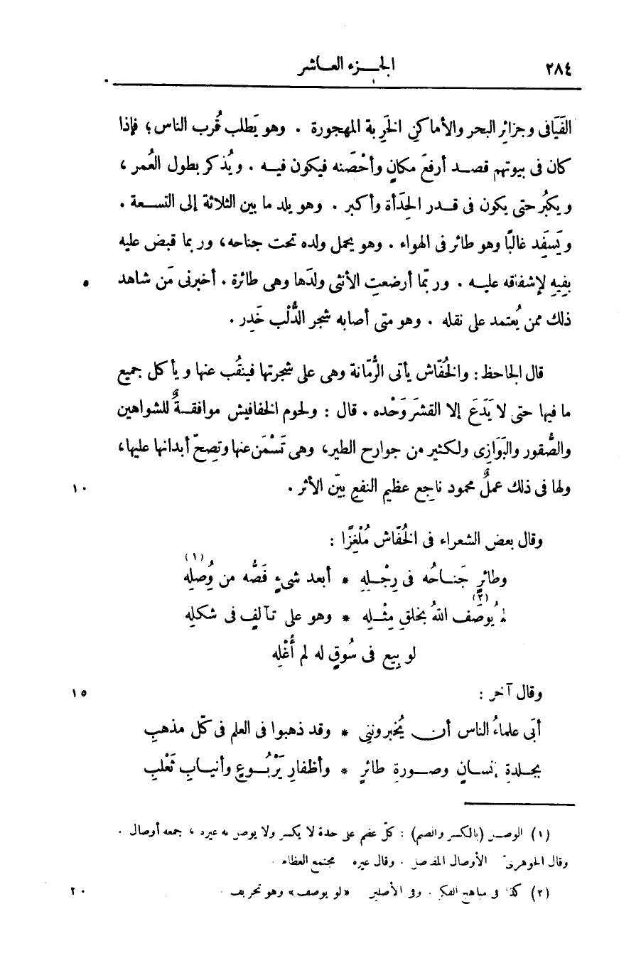 ويسفد غالبا وهو طائر فى الهواء. وهو يحمل ولده تحت جناحه، وربما قبض عليه بفيه لإشفاقه عليه. وربّما أرضعت الأنثى ولدها وهى طائرة. أخبرنى من شاهد ذلك ممن يعتمد على نقله. وهو متى أصابه شجر الدّلب خدر.