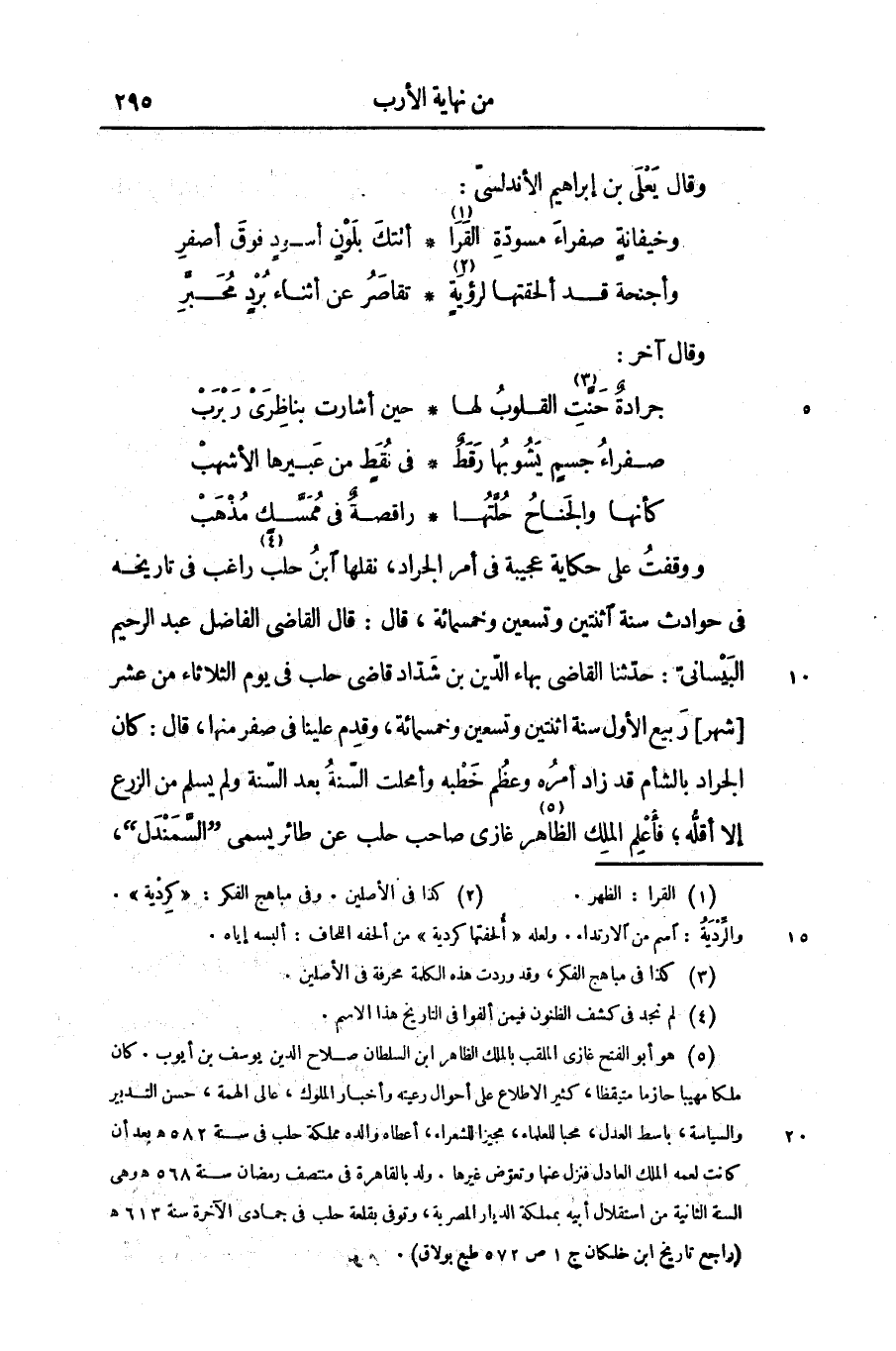 ووقفت على حكاية عجيبة فى أمر الجراد، نقلها ابن حلب «4» راغب فى تاريخه فى حوادث سنة اثنتين وتسعين وخمسمائة، قال: قال القاضى الفاضل عبد الرحيم البيسانىّ: حدّثنا القاضى بهاء الدّين بن شدّاد قاضى حلب فى يوم الثلاثاء من عشر [شهر] ربيع الأول سنة اثنتين وتسعين وخمسمائة، وقدم علينا فى صفر منها، قال: كان الجراد بالشأم قد زاد أمره وعظم خطبه وأمحلت السّنة بعد السّنة ولم يسلم من الزرع إلا أقلّه؛ فأعلم الملك الظاهر «5» غازى صاحب حلب عن طائر يسمى «السّمندل» ،