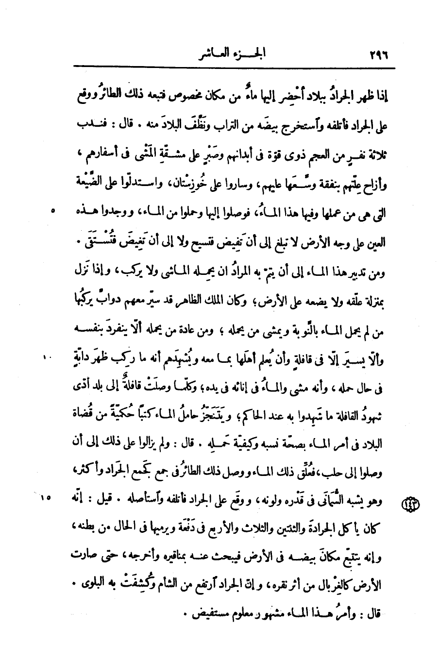 إذا ظهر الجراد ببلاد أحضر إليها ماء من مكان مخصوص فتبعه ذلك الطائر ووقع على الجراد فأتلفه واستخرج بيضه من التراب ونظّف البلاد منه. قال: فندب ثلاثة نفر من العجم ذوى قوّة فى أبدانهم وصبر على مشقّة المشى فى أسفارهم، وأزاح علّتهم بنفقة وسّعها عليهم، وساروا على خوزستان، واستدلّوا على الضّيعة التى هى من عملها وفيها هذا الماء، فوصلوا إليها وحملوا من الماء، ووجدوا هذه العين على وجه الأرض لا تبلغ إلى أن تفيض فتسيح ولا إلى أن تغيض فتستقى.
