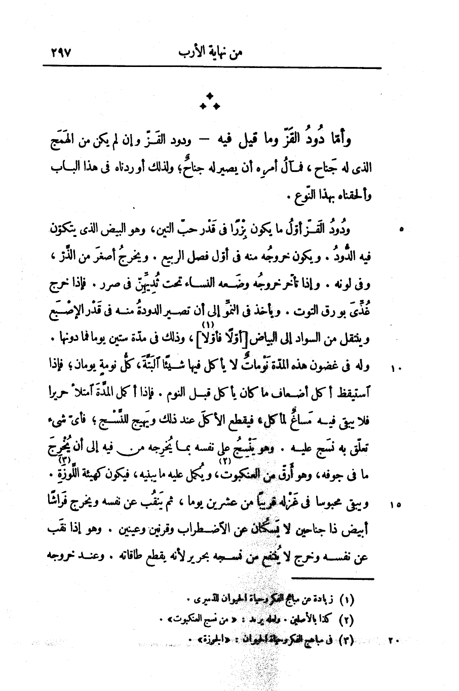 ودود القزّ أوّل ما يكون بزرا فى قدر حبّ التين، وهو البيض الذى يتكوّن فيه الدّود. ويكون خروجه منه فى أوّل فصل الربيع. ويخرج أصغر من الذّرّ، وفى لونه. وإذا تأخّر خروجه وضعه النساء تحت ثديّهنّ فى صرر. فإذا خرج غذّى بورق التوت. ويأخذ فى النّمو إلى أن تصير الدودة منه فى قدر الإصبع وينتقل من السواد إلى البياض [أوّلا فأوّلا «1» ] ، وذلك فى مدّة ستين يوما فما دونها.
