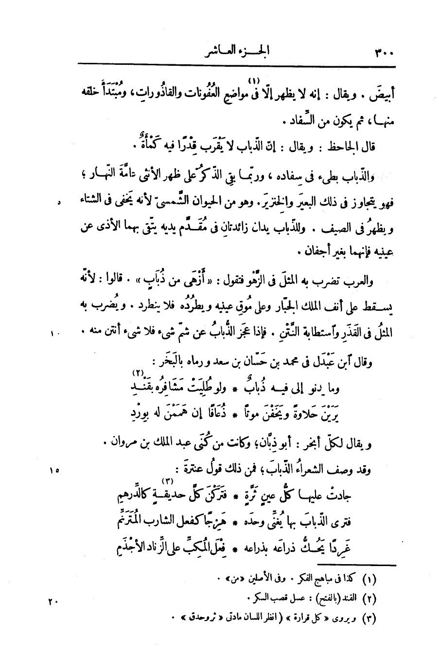 والذّباب بطئ فى سفاده، وربّما بقى الذّكر على ظهر الأنثى عامّة النّهار؛ فهو يتجاوز فى ذلك البعير والخنزير. وهو من الحيوان الشّمسى لأنه يخفى فى الشتاء ويظهر فى الصيف. وللذّباب يدان زائدتان فى مقدّم يديه يتّقى بهما الأذى عن عينيه فإنهما بغير أجفان.