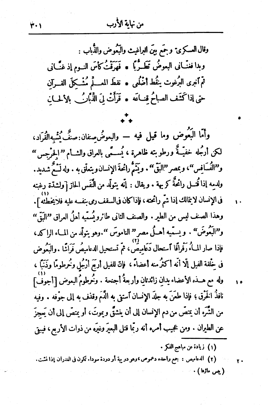 وهذا الصنف ليس من الطير. والصنف الثانى طائر ويسمّيه أهل العراق «البقّ» و «البعوض» . ويسمّيه أهل مصر «الناموس» . وهو يتولّد من الماء الراكد، فإذا صار الماء رقراقا استحال دعاميص «2» ، ثم تستحيل الدعاميص فراشا. والبعوض فى خلقة الفيل إلّا أنّه أكثر منه أعضاء، فإنّ للفيل أربع أرجل وخرطوما وذنبا، وله مع هذه الأعضاء يدان زائدتان وأربعة أجنحة. وخرطوم البعوض [أجوف «3» ] نافذ الخرق؛ فإذا طعن به جلد الإنسان استقى به الدّم وقذف به إلى جوفه. وفيه من الشّره أن يمتصّ من دم الإنسان إلى أن ينشقّ ويموت، أو يمتصّ إلى أن يعجز عن الطيران. ومن عجيب أمره أنه ربّما قتل البعير وغيره من ذوات الأربع، فيبقى