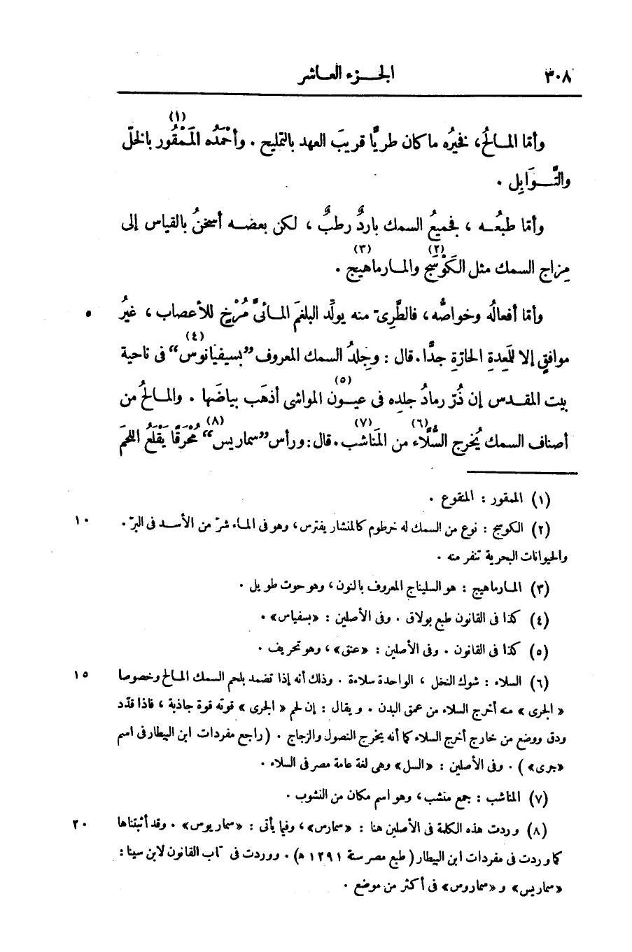 وأمّا طبعه، فجميع السمك بارد رطب، لكن بعضه أسخن بالقياس إلى مزاج السمك مثل الكوسج «2» والمارماهيج «3» .