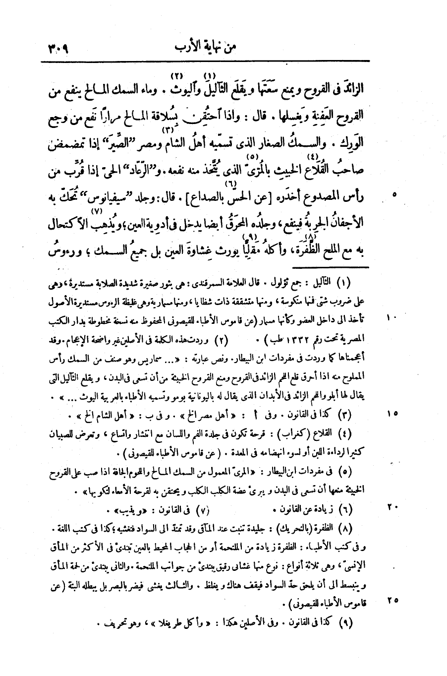 الزائد فى القروح ويمنع سعتها ويقلع الثآليل «1» واليوث «2» . وماء السمك المالح ينفع من القروح العفنة ويغسلها. قال: واذا احتقن بسلاقة المالح مرارا نفع من وجع الورك. والسمك الصغار الذى تسمّيه أهل الشام «3» ومصر «الصّير» إذا تمضمض صاحب القلاع «4» الخبيث بالمرّىّ «5» الذى يتّخذ منه نفعه. و «الرّعّاد» الحىّ إذا قرّب من رأس المصدوع أخدره [عن الحسّ «6» بالصداع] . قال: وجلد «سيفيانوس» تحكّ به الأجفان الجربة فينفع، وجلده المحرق أيضا يدخل فى أدوية العين؛ ويذهب «7» الاكتحال به مع الملح الظّفرة «8» ، وأكله مقليّا «9» يورث غشاوة العين بل جميع السمك؛ ورءوس