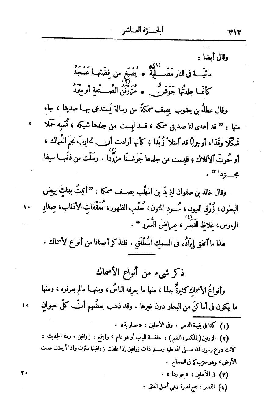 هذا ما اتفق إيراده فى السمك المطلق. فلنذكر أصنافا من أنواع الأسماك.