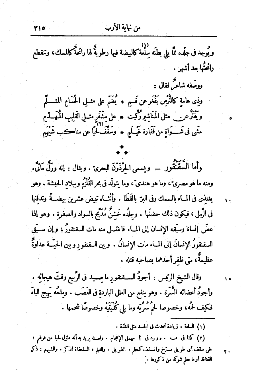 ومنه ما هو مصرىّ، وما هو هندىّ، وما يتولّد فى بحر القلزم وببلاد الحبشة. وهو يغتذى فى الماء بالسمك وفى البرّ بالقطا. وأنثاه تبيض عشرين بيضة وتدفنها فى الرّمل، فيكون ذلك حضنها. وجلده خشن مدبّج بالسواد والصفرة. وهو إذا عضّ إنسانا وسبقه الإنسان إلى الماء فاغتسل منه مات السقنقور؛ وإن سبق السقنقور الإنسان إلى الماء مات الإنسان. وبين السقنقور وبين الحيّة عداوة عظيمة، متى ظفر أحدهما بصاحبه قتله.