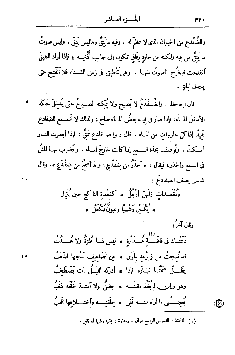والضّفدع من الحيوان الذى لا عظم له. وفيه ما ينقّ. وما ليس ينقّ. وليس صوت ما ينقّ من فيه ولكنه من جلود رقاق تكون إلى جانب أذنيه؛ فإذا أراد النقيق انفتحت فيخرج الصوت منها. وهى تنطبق فى زمن الشتاء فلا تنفتح حتى يعتدل الجوّ.