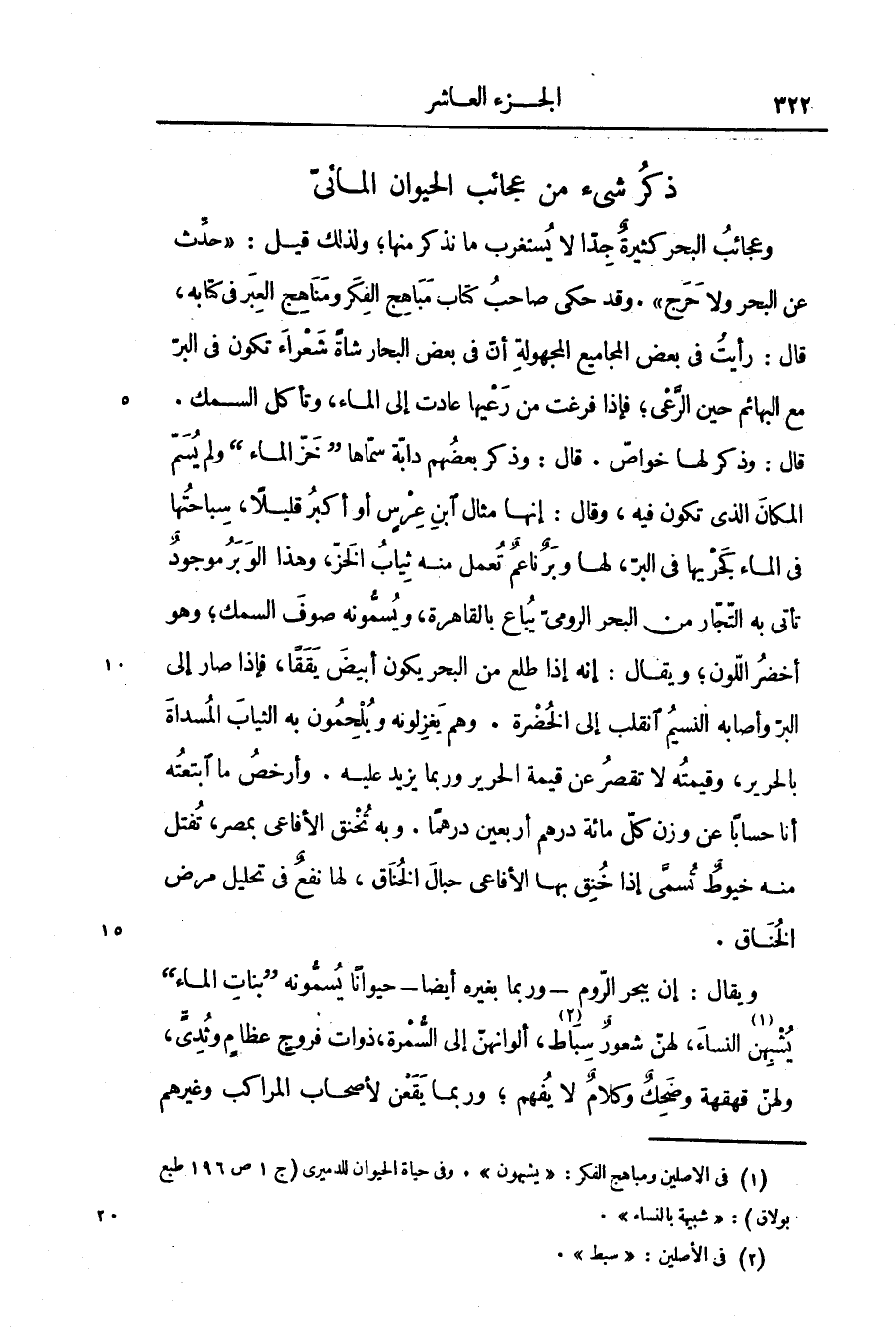 وعجائب البحر كثيرة جدّا لا يستغرب ما نذكر منها؛ ولذلك قيل: «حدّث عن البحر ولا حرج» . وقد حكى صاحب كتاب مباهج الفكر ومناهج العبر فى كتابه، قال: رأيت فى بعض المجاميع المجهولة أنّ فى بعض البحار شاة شعراء تكون فى البرّ مع البهائم حين الرّعى؛ فإذا فرغت من رعيها عادت إلى الماء، وتأكل السمك.