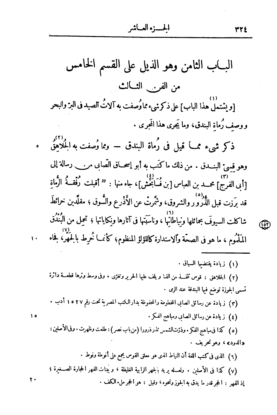 [ويشتمل «1» هذا الباب] على ذكر شىء مما وصفت به آلات الصيد فى البرّ والبحر ووصف رماة البندق، وما يجرى هذا المجرى.