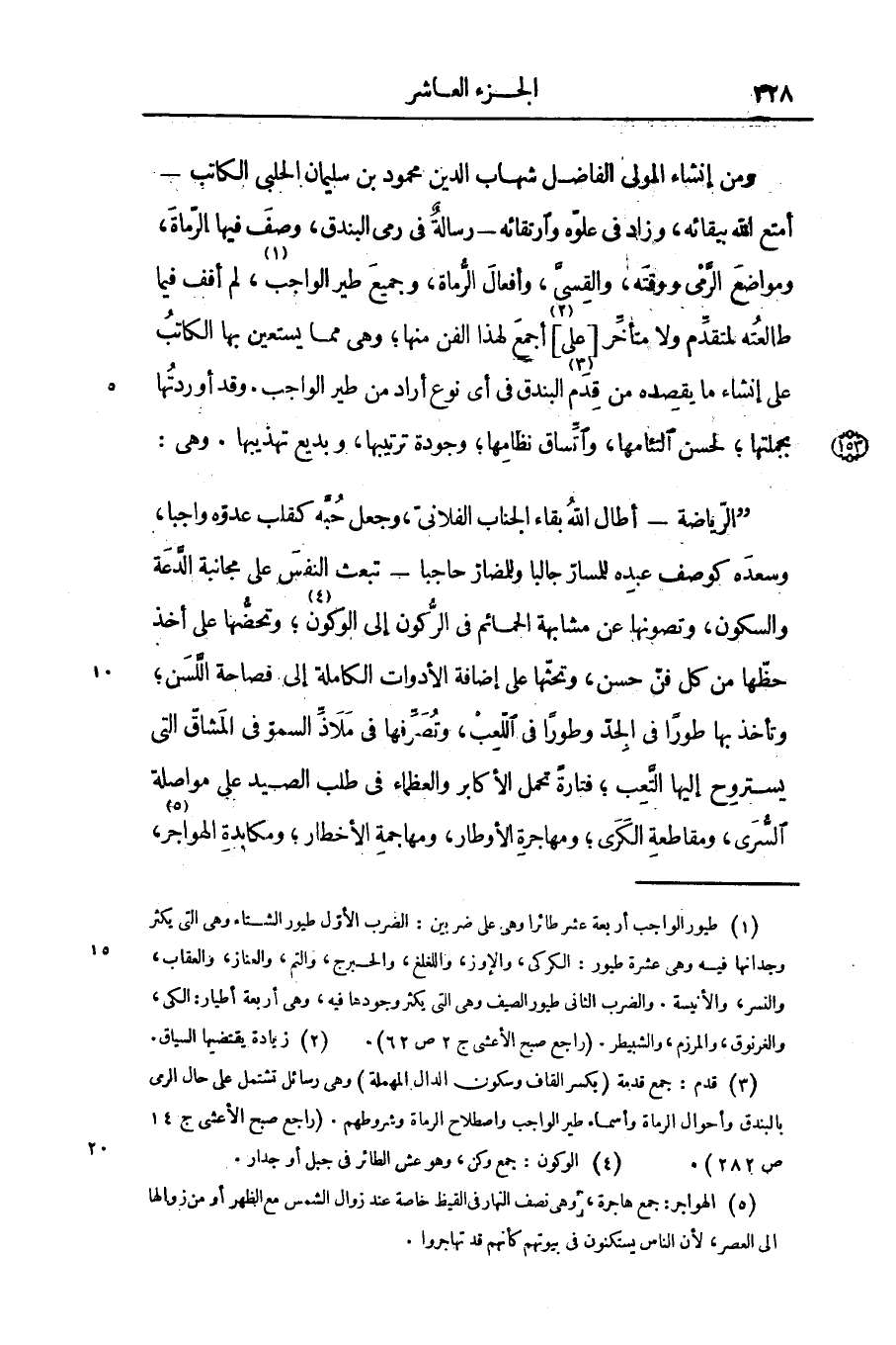 ومن إنشاء المولى الفاضل شهاب الدين محمود بن سليمان الحلبى الكاتب- أمتع الله ببقائه، وزاد فى علوّه وارتقائه- رسالة فى رمى البندق، وصف فيها الرّماة، ومواضع الرّمى ووقته، والقسىّ، وأفعال الرّماة، وجميع طير الواجب «1» ، لم أقف فيما طالعته لمتقدّم ولا متأخّر [على «2» ] أجمع لهذا الفن منها؛ وهى مما يستعين بها الكاتب على إنشاء ما يقصده من قدم «3» البندق فى أى نوع أراد من طير الواجب. وقد أوردتها بجملتها؛ لحسن التئامها، واتّساق نظامها؛ وجودة ترتيبها، وبديع تهذيبها. وهى: