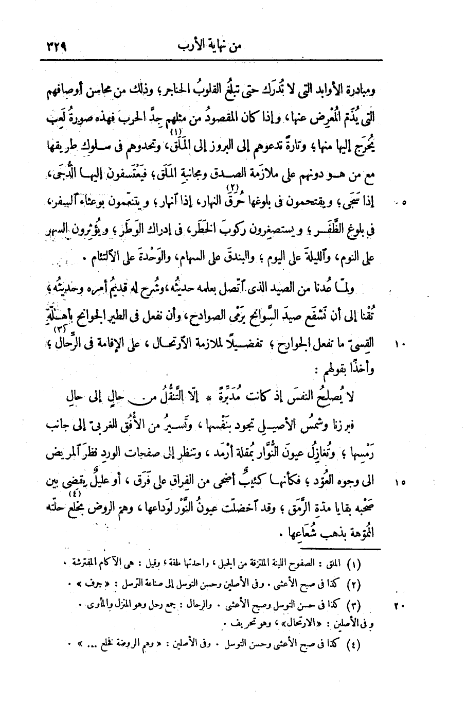 ومبادرة الأوابد التى لا تدرك حتى تبلغ القلوب الحناجر؛ وذلك من محاسن أوصافهم التى يذمّ المعرض عنها، وإذا كان المقصود من مثلهم جدّ الحرب فهذه صورة لعب يخرج إليها منها؛ وتارة تدعوهم إلى البروز إلى الملق «1» ، وتحدوهم فى سلوك طريقها مع من هو دونهم على ملازمة الصدق ومجانبة الملق؛ فيعتسفون إليها الدّجى، إذا سجى؛ ويقتحمون فى بلوغها حرق «2» النهار، إذا انهار؛ ويتنعّمون بوعثاء السفر، فى بلوغ الظّفر؛ ويستصغرون ركوب الخطر، فى إدراك الوطر؛ ويؤثرون السهر على النوم، والليلة على اليوم؛ والبندق على السهام، والوحدة على الالتئام.