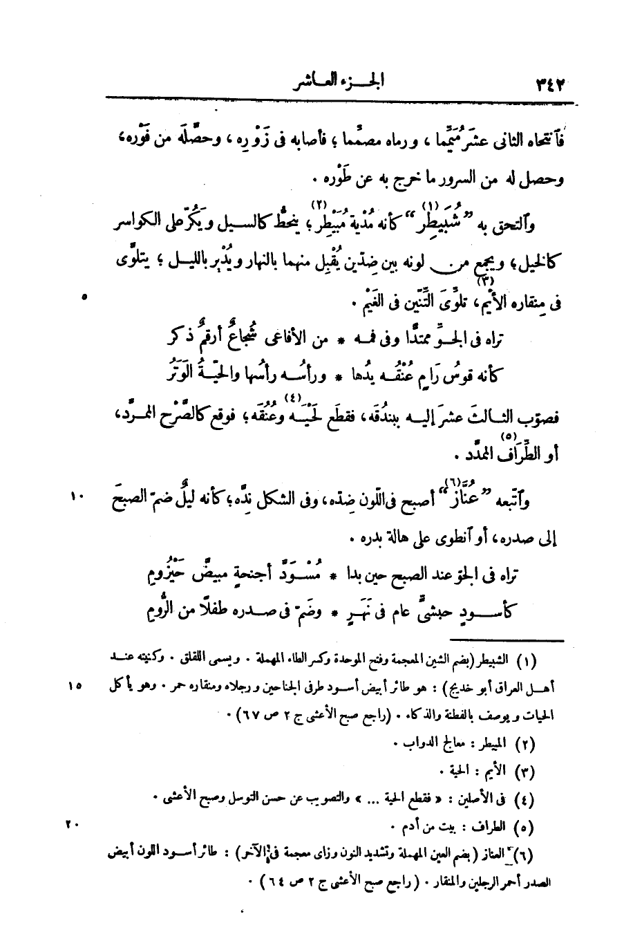 والتحق به «شبيطر «1» » كأنه مدية مبيطر «2» ؛ ينحطّ كالسيل ويكرّ على الكواسر كالخيل، ويجمع من لونه بين ضدّين يقبل منهما بالنهار ويدبر بالليل؛ يتلوّى فى منقاره الأيم «3» ، تلوّى التّنّين فى الغيم.