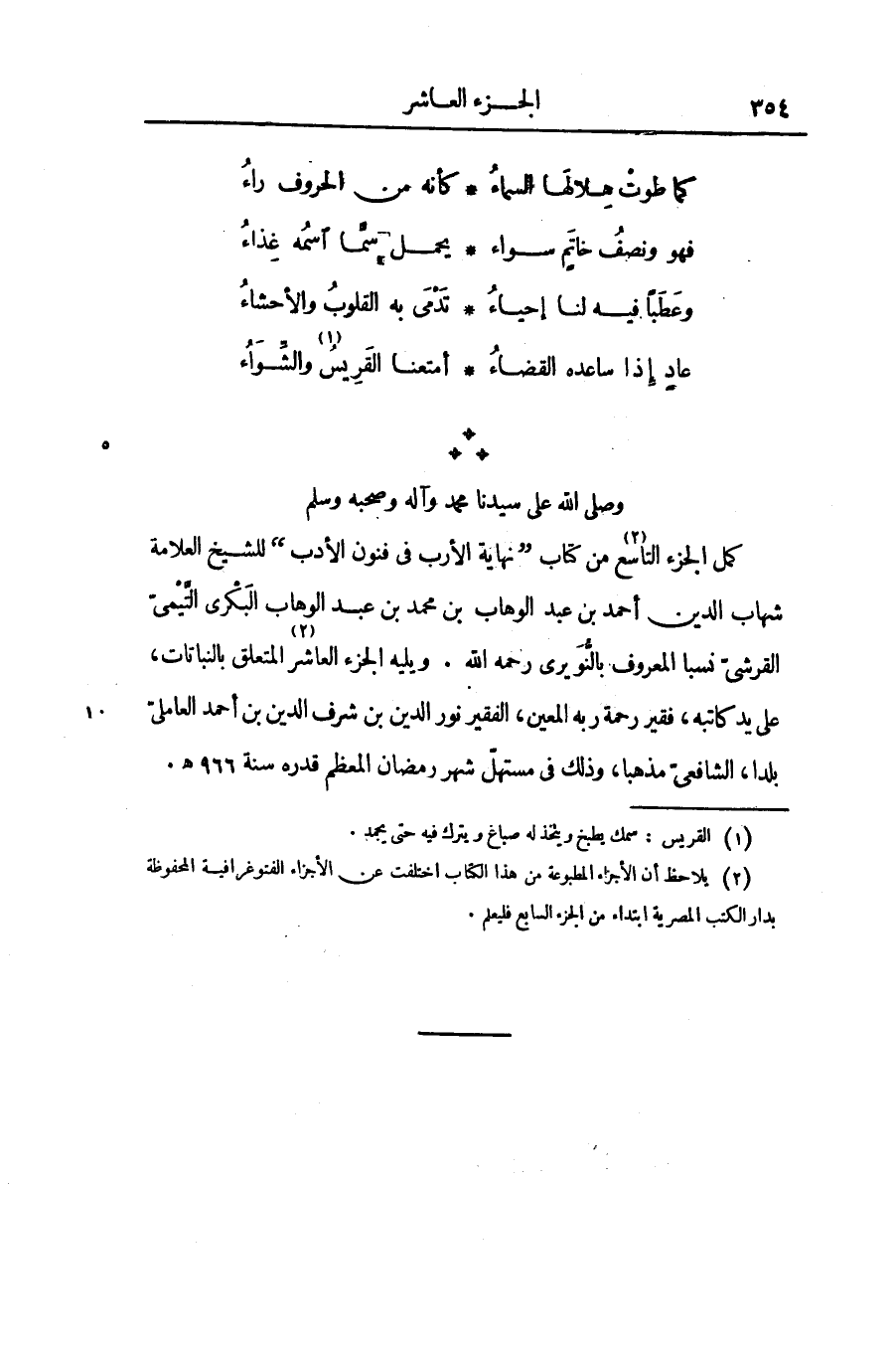 وصلى الله على سيدنا محمد وآله وصحبه وسلم كمل الجزء التاسع «2» من كتاب «نهاية الأرب فى فنون الأدب» للشيخ العلامة شهاب الدين أحمد بن عبد الوهاب بن محمد بن عبد الوهاب البكرى التّيمىّ القرشىّ نسبا المعروف بالنّويرى رحمه الله. ويليه الجزء العاشر «3» المتعلق بالنباتات، على يد كاتبه، فقير رحمة ربه المعين، الفقير نور الدين بن شرف الدين بن أحمد العاملىّ بلدا، الشافعىّ مذهبا، وذلك فى مستهلّ شهر رمضان المعظم قدره سنة 966 هـ.